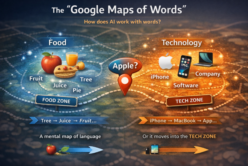 In this space, words that frequently appear together become close to each other. This means the AI doesn’t learn definitions. It learns patterns of usage.